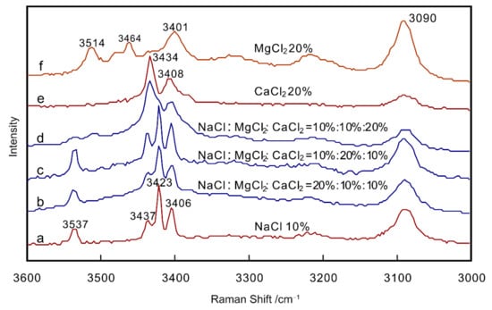 Ternary NaCl, MgCl2 and CaCl2 solutions were prepared at 20, 10, 10 wt.% (Figure 14b), 10, 20, 10 wt.%(Figure 14c) and 10, 10, 20 wt.%(Figure 14d). The spectra that Figure 14 shows all cooled by the secondary freezing method. The characteristic peaks of hydrohalite are at 3406, 3423, 3437, and 3537 cm−1 [22] (Figure 14a, NaCl: 10 wt.%), and those of MgCl2 hydrate are at 3401, 3464, 3481, and 3514 cm−1 [22] (Figure 14f, MgCl2: 20 wt.%), and 3408, 3434 cm−1 are associated with O–H stretching in antarcticite (CaCl2 hydrate) [22] (Figure 14e, CaCl2: 20 wt.%).