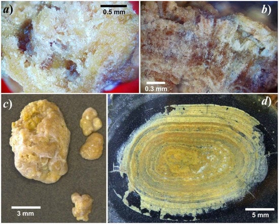 Fragments of urate renal stones: (a) monophase renal stone with uricite single crystals; (b) fragment of the urate renal stone with yellowish uricite zones and white tinnunculite zones; (c) typical urate renal stones excreted at one time; and (d) thin section of large urate renal stone, showing zonal distribution of uricite (light yellow) and organic substance.