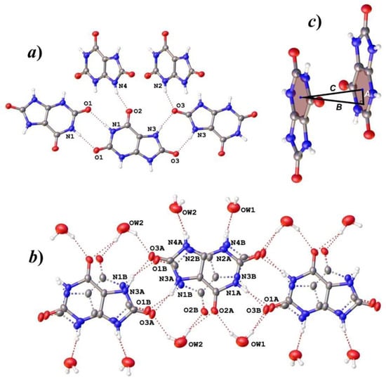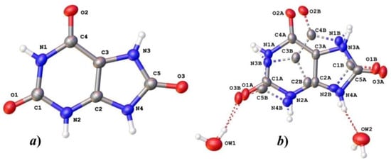Notably, the uric acid moiety in the structure of UAD is disordered over two superimposed orientations obtained by rotation around a statistical two-fold axis passing in the plane of the molecule and along the [001] direction (Figure 2b). In the case of the reported UAD structure, the ratio of moieties having different orientations is 0.59(1):0.41(1), with a total site occupancy factor (s.o.f.) of 1.0. Such disorder appears typical for the UAD crystals but may vary significantly. The other two UAD crystals that were selected from the same renal stone had nearly the same ratios (~0.6:0.4), whereas in a previous work, a 0.83:0.17 ratio was reported [17]. However, no such disorder has been reported for UA structures. Most likely, the occurrence of interlayer H2O molecules loosens the structure, which results in the relaxation of the π-stacking system. As a result, a rather significant increase in the plane-to-plane shift and centroid-to-centroid distances is observed (Table 2). In turn, this allows uric acid molecules’ presence in two different orientations, especially in the rigid arrangement of H2O sites.