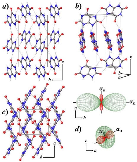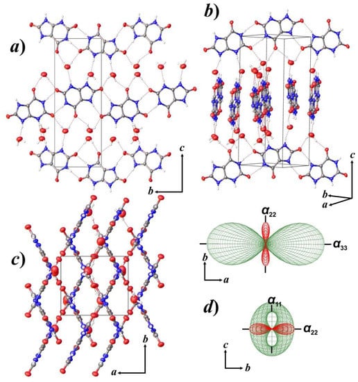 The appearance of H2O molecules between the layers of uric acid molecules in the structure of UAD slightly affects the figure of the thermal expansion coefficients’ orientation (Figure 5d), but not the mechanism of the expansion. Being almost orthogonal, the unit cell of UAD has the maximal expansion along the a-axis and contraction along the b-axis due to the same decrease in the obtuse angle and respective increase in the acute twisted angle (from 63° to 66°; Figure 5c), the same as in the structure of UA.