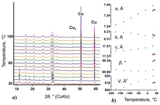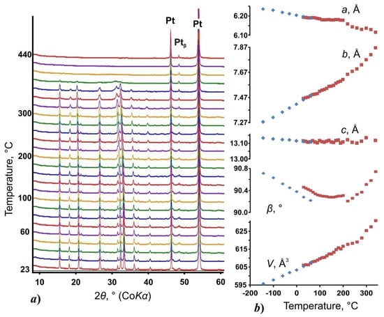 Figure 6b shows the behavior of the unit-cell parameters of UA as a function of temperature. As seen from the graphs, an essential change in the temperature dependence character starts after 210 °C. The powder pattern of UA (Figure 6a) remains almost unchanged up to 220 °C, where two diffraction maxima at 2θ = 32–33° merge into one peak. Unfortunately, we were unable to collect the SC data at the specified temperature range to understand what is happening with the structure, but according to the similarity of the patterns, it is likely that an overall structural motif remains the same up to 380 °C, where the crystallinity of the phase is lost. The only diffraction peaks left within the pattern after 400 °C are attributed to the Pt sample holder. Equations describing the temperature dependence of the unit-cell parameters of UA within the range of −143 to 60 °C are: a = 6.204 − 2.416 × 10−4 × T to 1.192 × 10−7 × T2; b = 7.417 + 1.113 × 10−3 × T + 8.478 × 10−7 × T2; c = 13.116 − 1.147 × 10−4 × T + 3.250 × 10−8 × T2; β = 90.374 − 2.605 × 10−3 × T − 1.520 × 10−6 × T2; and V = 603.5 + 61.9 × 10−3 × T + 5.0 × 10−5 × T2.
