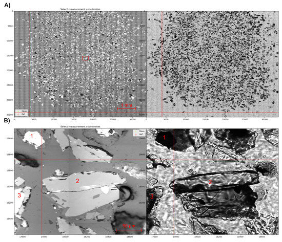 The “Hit Index” (HI, Equation (1)) is computed for each pair of sample and reference spectra, where refm refers to the mean-centered reference spectrum, smplm refers to the mean-centered sample spectrum and the dot indicates vector dot products [44]. The HI is a correlation method with a success rate of ca. 80% (e.g., [45]) and ranges between 0 and 1, with 0 indicating a perfect match and 1 absolute disagreement. HI thresholds were empirically determined, and the identification results were differentiated into three groups: “Good hit” 0.0 to 0.15, “Medium hit” 0.15 to 0.3 and “No hit” for HI > 0.3. Spectra of the “Good hit” group are accepted, spectra of the “No hit” group are neglected and spectra of the “Medium hit” group should be reexamined, because these can contain correctly identified minerals, but often consist of mixed or poor quality spectra. After identification, the mineral names are sorted into a list of mineral groups approved by the International Mineralogical Association (IMA). The list (see “mineral dictionary” in the supplements) consists of mineral groups of the most common light minerals and mineral groups that contain heavy minerals, e.g., minerals with a density of 2.85 g/cm3 or higher. The output of the evaluation routine is a .csv file that contains all results, three csv files which contain the results sorted by the HI group intervals and a .png file that shows the sample spectrum with the “best hit” reference spectrum (e.g., Figure 5B).