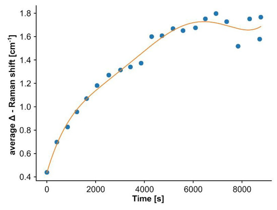Temporal drift correction. The average deviation of 10 Raman band positions of 4-Acetamidophenol from the reported band positions [38] is plotted against the measurement time. It is apparent that the temporal drift is significant, and that the system stabilized after ca. 1.5 h.
