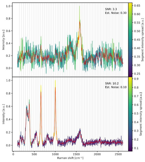 Noise estimation. Each vertical gray bar marks a segment of the spectrum and the color bar shows the intensity spread within each segment. Segments that contain a Raman band will have a large intensity spread, while segments without Raman bands will have a low intensity spread. The 25th percentile of all intensity spread values is reported as the estimated noise. The spectrum in the upper panel would be rejected and the spectrum in the lower panel would be accepted for further processing (LOD at SNR-threshold 10).
