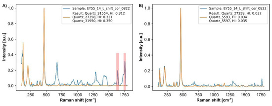Embedding medium correction. The left panel (A) shows a composite spectrum of quartz and UV glue. Quartz is correctly identified, but the poor hit index of >0.3, due to the presence of UV-glue Raman bands, would lead to rejection of this result. A scaling factor for the UV-glue spectrum is computed based on the intensity ratio of the red shaded bands. A reference UV-glue spectrum is multiplied with the scaling factor and subtracted from the composite spectrum, leading to the corrected spectrum (right panel, B). After processing the hit index improves by an order of magnitude and the result would be accepted.