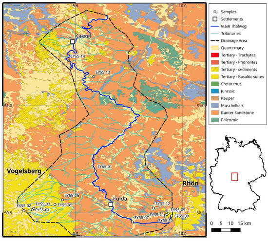 The Fulda drainage area (Figure 6) contains a vast proportion of Lower Triassic siliciclastic sedimentary rocks of the Bunter sandstone formation and Middle Triassic carbonates of the Muschelkalk formation. In the lower reaches of the drainage area some Permian carbonates and evaporites of the Zechstein formation and few clastic sediments of the Rotliegend formation crop out. Major occurrences of Tertiary (Miocene, 19–10 Ma) volcanic rocks are found in the Vogelsberg volcanic complex (VVC) and in the northern Rhön area at the “Wasserkuppe” close to the Fulda spring. Some more volcanic spots together with Oligocene to Miocene sediments occur further downstream in the vicinity of the city of Kassel (Figure 6). The volcanic rocks in the Fulda drainage area are mainly olivine-bearing alkali basalts and tholeiitic basalts with minor trachytes (VVC and northern Rhön) and phonolites (only northern Rhön). Quaternary deposits are dispersed across the complete drainage area and are mainly composed of loess.