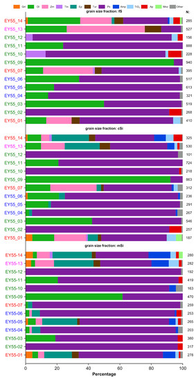 Table 3 lists all results related to the heavy-mineral assemblages determined by the method outlined in Section 2. The number of total spectra varies between 700 and 1200. Only transparent spectra with a SNR > 10 were evaluated. The difference between the number of spectra in the “Good hit” group and the number of spectra per heavy-mineral assemblage differs mainly due to the presence of light minerals, e.g., 668 “Good hit” spectra vs. 285 heavy-mineral spectra in fine sand sample EY55-14 (see “HM_result_files” in the supplements).