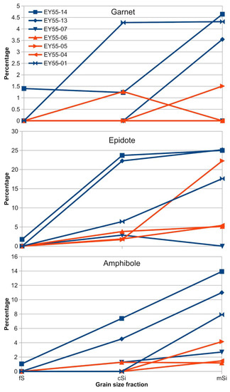 Grain size trends. The three panels show that the content of garnet, epidote, and amphibole, given in percentage of the heavy-mineral assemblage, increases in all sediment samples with decreasing grain size.