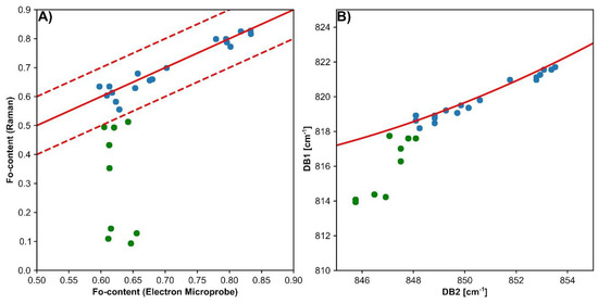 Fo content in olivines estimated by Raman spectroscopy. Panel (A) shows the forsterite content estimated from the Raman spectrum following the approach of [19] vs. electron microprobe data. The dashed lines mark the reported uncertainty of ± 0.1 for the Raman-based estimate. The green data points mark samples for which the Raman approach significantly underestimated the forsterite content. Panel (B) shows the trend in positional shift of the DB1 and DB2 Raman bands. The trend with increasing Fo content, as reported in [19], is indicated by the red line and the data points that produce Fo underestimates are shown in green.