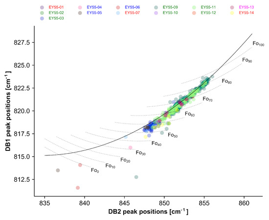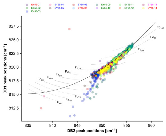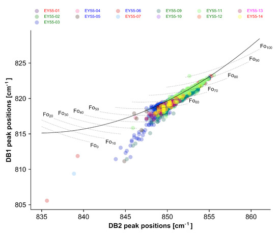The estimation of the content of the Mg-endmember (forsterite content) after [19] is based on the shift of two Raman bands in the olivine spectrum related to internal stretching vibrations of the SiO4-group [57]. These bands are named DB1 and DB2 in [19] and occur at Raman shift values of ca. 820 cm-1 and ca. 850 cm−1. A suite of olivines, identified as such by the outlined approach (Methods section), were also analyzed by EMPA. The forsterite (Fo) contents estimated by Raman and EMPA range between 55% and 85% and are in good agreement within an uncertainty of ±10% Fo content for most of the analyses (blue dots in Figure 9A). However, the Fo content of several olivines with Fo content around 60% to 65% according to EMPA is severely underestimated by Raman spectroscopy (green dots in Figure 9A). The main trend in DB1 and DB2 positions of all analyzed olivines reveals a range of Fo contents between ca. 55 to 100% (Figure 10), while the hard rock basalt samples (EY55-03, -09, -11) show a second trend (Figure 10, Figure 11 and Figure S3) that deviates from the Fo content related trendline. This second trend is no longer observed in the finest grain size fraction (mSi, Figure 12) and not in any of the sediment samples (Figure 10, Figures S2 and S4).