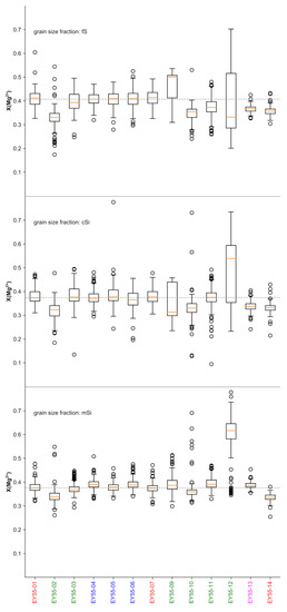 Boxplots of X(Mg2+) for all samples and grain size fractions. The dashed line marks the average Mg2+-content of basaltic clinopyroxenes of the Vogelsberg volcanic complex (samples EY55-03 to EY55-06) for the respective grain size fraction. The clinopyroxene phenocrysts (grain size fraction cSi and fS) of the higher differentiated rocks (EY55-02, -10, -12) show the lowest Mg2+-contents, while the spread and average Mg2+-content in the sediment samples decrease with increasing transport distance (proximal samples: EY55-01 and -07; distal sample: EY55-14). The distributions of Mg2+-contents of the matrix clinopyroxenes (grain size fraction mSi) are generally very similar.