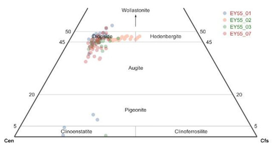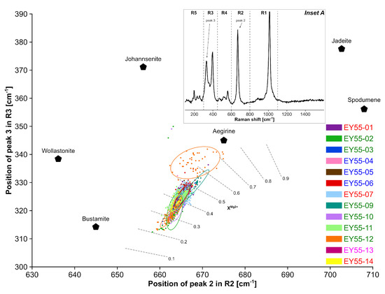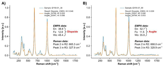Approaches after [20,58,59] allow estimation of the chemical composition of pyroxenes in terms of Ca, Mg, and Fe content by Raman spectroscopy. The molar ratios XMg2+ (Mg2+/(Mg2+ + Ca2+ + Fe2+)) and XCa2+ (Ca2+/(Ca2+ + Mg2+ + Fe2+)) can be determined using the procedure after [20] and this method was tested on pyroxenes selected from samples EY55-01, -02, -03, and -07. To this end the chemical compositions of pyroxenes, identified by Raman spectroscopy, were determined by EMPA. Comparing the compositional results based on the procedure after [20] to EMPA results indicates that XMg2+ can be estimated within ±0.1 range by Raman spectroscopy and XCa2+ is generally overestimated by Raman spectroscopy which in turn leads to an underestimation of XFe2+ (Figure 13).