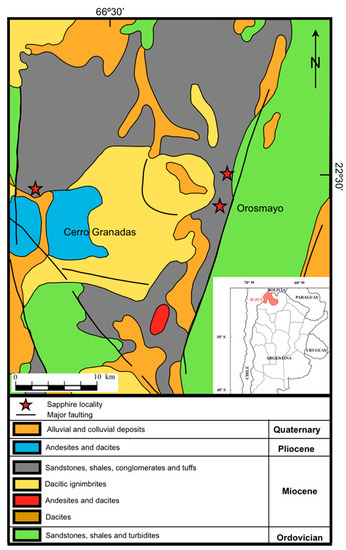 - Harris, S.J.; Graham, I.T.; Lay, A.; Powell, W.; Belousova, E.; Zappettini, E. Trace element geochemistry and metasomatic origin of alluvial sapphires from the Orosmayo region, Jujuy Province, northwest Argentina. Can. Mineral. 2017, 55, 595–617. [Google Scholar] [CrossRef]
