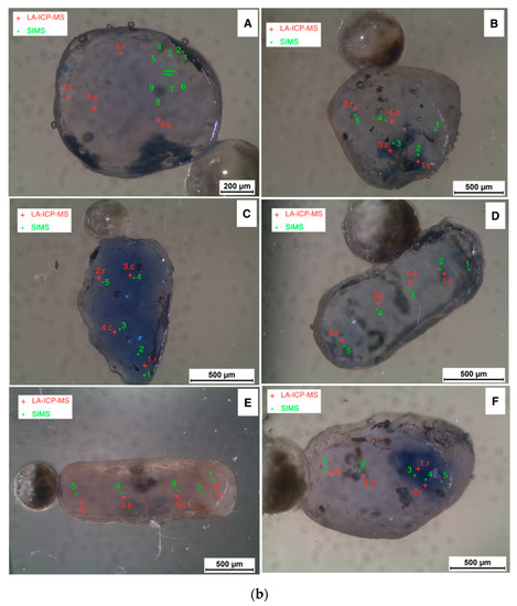 Images of the analyzed sapphires with both LA–ICP–MS and SIMS analysis spots indicated (a). A = AC-1, B = AC-2, C = AC-3, D = AC-4, E = AC-5 and F = AC-7. (b) A = AC-10, B = AC-11, C = AC-13, D = AC-14, E = AC-15 and F = AC-16).