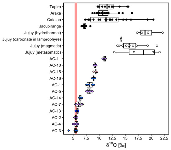 Diagram showing the range in oxygen isotope values for Jujuy sapphires (this study) in comparison to carbonatites and lamprophyres from the Jujuy region [17] and those of carbonatites from Brazil [18] and mantle δ18O value (red band).