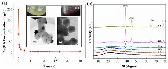 The interaction between bacteria and Au(III) with time. (a) The Au(III) concentration in aqueous solution. The inserts show the color of the culture (top) at 0 h and 48 h, respectively; and TEM images of cells and Au particles (bottom) at 48 h. (b) XRD pattern of the AuNPs enhanced over time.