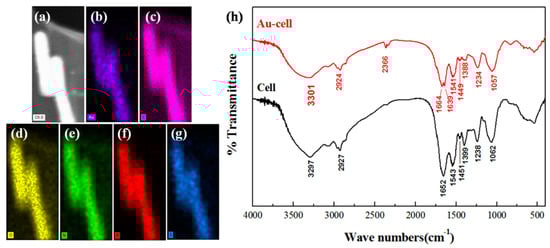 (a) SEM image of B. licheniformis FZUL-63 after interaction with gold; (b–g) elemental maps of Au, C, O, N, P, and S, respectively; (h) Fourier transformed infrared spectra of B. licheniformis FZUL-63 biomass: before and after gold uptake (initial concentration of 200 mg Au (III) L−1 at pH 6.0, time 1 h).