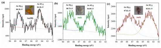 XPS spectra of the Au(4f) region of interaction with bacteria for (a) 0 h; (b) 1 h; and (c) 48 h.