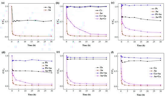 The aqua regia-based metal wastewater usually contains the following metal ions: Au(III), Pt(III), Ag(I), Cr(VI), Pb(II), Zn(II), and Cu(II). The chloroauric acid and the silver ion cannot coexist in the solution. Therefore, we only conducted experiments using gold and silver acting alone with bacteria, and their recovery percentages were 97.66% and 49.23%, respectively (Figure 4a). The 200 mg/L Cr(VI) ions could delay the recovery balance time of the gold from one hour to 18 h, and the recovery percentage of gold was also reduced from 97.66% to 91.93% (Figure 4b). Zn(II) and Cu(II) rarely influenced the Au(III) recovery (Figure 4c,d). However, for the 200 mg/L Pt(III) or Pb(II) coexisting with Au(III), the recovery percentage of gold was reduced from 97.66% to 85.06% and 93.31%, respectively (Figure 4e,f).