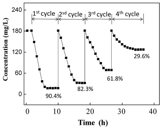 As Figure 5 shows, through the first treatment, the recovery percentage of gold was 90.4%. After the second treatment, the gold recovery percentage dropped to 82.3%. The gold recovery percentages were 61.8% and 29.6% at the third and fourth treatment, respectively. AuNPs could be recovered by acid dissolution. For example, the bacteria and gold nanoparticles were collected by centrifugation at 5400 g for 10 min and treated with 1 mol/L HCl, which may dissolve the bacterial cells. Then, the acid dissolution sample was centrifuged at low rotation speed (2000 rpm for 20 min) to remove supernatant containing cell debris, DNA and so on. The pellet was gold particles with high purity. With four cycles, we could recover 478 mg of AuNPs per gram of bacteria from the aqua regia-based metal wastewater.