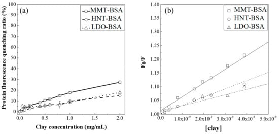 (a) The protein fluorescence quenching ratio depending on the clay’s concentration, (b) fitting of the quenching data to the Stern–Volmer equation.