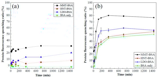 In addition, we investigated the time and temperature dependent fluorescence quenching behavior under a fixed concentration of clay and protein. A temperature of 60 °C was chosen as it was known that thermal aggregation begins at around this temperature [46,47], and thus we might see clay–protein interactions in different aspects through a temperature dependent study. As shown in Figure 6a, the protein itself did not show any fluorescence quenching at 25 °C. Under the presence of clays, the quenching ratio increased up to 30% and the order was the same as the magnitude of the values. At the elevated temperature of 60 °C, the aspect dramatically changed (Figure 6b). Protein without clay showed a quenching ratio up to 50% due to thermal aggregation. Interestingly, the quenching ratios in the presence of HNT (54%) and LDO (57%) were not significantly higher than that of protein alone, but the value with MMT (80%) was higher, suggesting denaturation of protein was the greatest with MMT under high temperature. Through the Stern–Volmer calculation and temperature experiment, we could confirm that MMT had the strongest clay–protein interaction and HNT had the lowest. LDO took the middle position in terms of adsorption capacity and preservation of protein three-dimensional conformation.