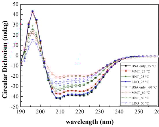 As the fluorescence quenching gives us information of the overall denaturation of proteins with clays, we then studied any microscopic change—helix or sheet—utilizing circular dichroism (CD) spectroscopy. It is known that CD spectroscopy is a powerful tool to evaluate the interaction (conformational change or adsorption) between proteins and external materials [30,44,45]. The CD spectrum of albumin alone (Figure 7) showed the positive band at 198 nm originated from the π→π* of a β-sheet and double negative bands at 208 nm and 222 nm, respectively, were attributed to π→π* and n→π* of a pure α-helical structure [31]. The ellipticity value in the spectrum was almost preserved in the presence of clays at 25 °C, except that MMT showed change in the double negative bands. This result is parallel to the recent report that the native-like secondary structure of insulin was well-preserved after incorporation into HNT [27]. The pattern was quite different at an elevated temperature (60 °C); the whole spectrum showed collapse of both negative and positive bands and the degree of collapse was in the following order: MMT-BSA > LDO-BSA > HNT-BSA > BSA alone. The CD result corresponded fairly well to the fluorescence quenching result. The overall denaturation and secondary structure was not seriously affected in the presence of the clays, except MMT. However, at an elevated temperature, along with thermal aggregation of proteins, clays might influence the three-dimensional structure, as well as the secondary structure, of proteins.