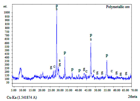 X-ray diffraction pattern of the concentrate where p—pyrite; s—sphalerite; g—galena and c—chalcopyrite.