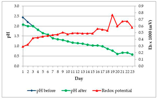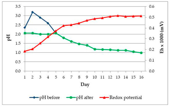 Four 250 mL flasks were used in the adaptation experiment. Solution for adaptation of bacteria was prepared with 4 × 98 mL H2O dist. and 3 × 2 mL of 50× concentrated basal salts solution, and pH value was set up at 2. Three flasks were inoculated with 1 mL samples from four enrichment media, while the fourth flask was a non-inoculated control. The adaptation was done in a Heidolph shaker at temperature of 30 °C and stirring speed of 150 rpm. The solid phase content in the flask was 5% (w/v). Figure 2 shows changes of pH and Eh (mV) in time (days).