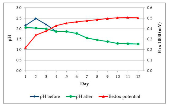 After adding the ore, the pH value in solution increased. In general, the pH value increased in first four days, but it was adjusted using sulphuric acid to the initial value pH = 2.