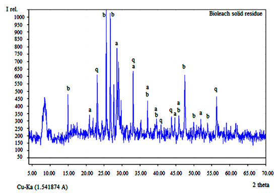 X-ray diffraction pattern of the bioleach residue where a—anglesite; b—beudantite; and q—quartz.