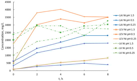It can be seen from Figure 2 and Figure 3 that nickel dissolution of LAI and LEV laterites at pH 1.5 is much lower than at pH 0.5 and 0.25. Higher acidity was needed for efficient nickel dissolution for LAI and LEV laterites. In contrast, nickel from LK dissolved considerably already at pH 1.5 and the dissolution was quite similar in all LK leaching tests. Some oscillation in the nickel concentrations was observed; this is most likely related to the addition of acid followed by the subsequent dissolution of metal. Nickel yields at pH 1.5 were 12% for LAI, 30.1% for LEV, and 87.5% for LK (see Table 4). However, the iron dissolution of LK was significantly higher when the pH was 0.25–0.5 compared to the test carried out at 1.5.
