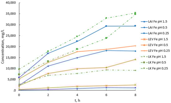 Evolution of Fe concentration vs. time during leaching of LAI, LEV, and LK laterites in pH 0.25, 0.5 and 1.5. Parameters used in the experiments: 90 °C, S/L = 30%, 800 rpm. pH was maintained by H2SO4 addition.