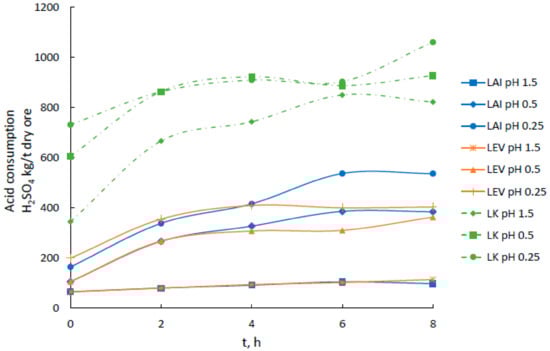Cumulative acid additions (H2SO4 kg/t dry ore) during leaching of the LAI, LEV, and LK laterites in pH 0.25, 0.5, and 1.5. Parameters used in the experiments: 90 °C, S/L = 30%, 800 rpm. pH was maintained by H2SO4 addition.