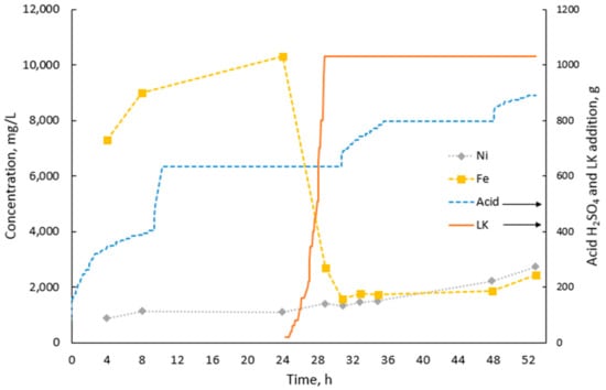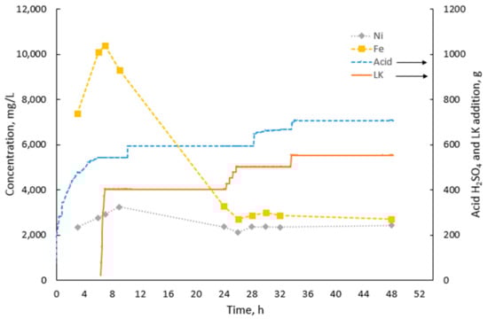 Leaching of LEV for 6 h at pH 0.75, followed by LK laterite addition increasing the pH to 1.8. Concentrations of Ni, Co, Fe, acid, and LK additions. Parameters used in the experiments: 90 °C, S/L = 30%, 800 rpm.