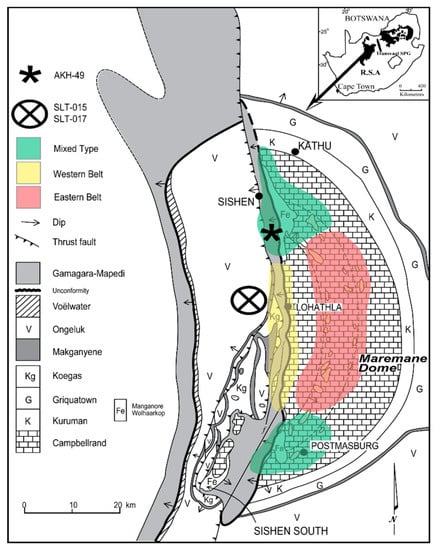 Before the discovery of the manganese ore deposits of the Kalahari Manganese Field (KMF), the Postmasburg Manganese Field (PMF) was South Africa’s largest producer of this important component of the steel industry []. The PMF deposits occur in two main belts (Figure 1), namely the Eastern and Western Belts, which stretch between Postmasburg in the south to Sishen in the north, a distance of approximately 65 km. The Western Belt occurs in a north–south extending zone in close proximity to a regional unconformity and a regional thrust fault. The Eastern Belt forms an elongated, curved zone which predominantly develops along strike of a regional fold structure known as the Maremane Dome. A mixed type exists at the northern and southern extremities of the PMF.