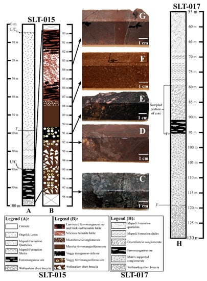Samples were selected from diamond drill cores SLT-15, SLT-017 from the western sector of the Maremane anticline, obtained as part of a prospecting drilling campaign for iron ore mineralisation; and from drill core AKH49 from the Khumani iron ore mine (the latter previously sampled by Moore et al. []; Figure 1). Drill core SLT-015 shows the typical stratigraphy of the Eastern Belt ores with Wolhaarkop breccia at the base (Figure 2A). The base of the core consists of clast-supported Wolhaarkop breccia which grades into ferromanganese ore. The ore is unconformably overlain by shales and quartzites of the Mapedi Formation at the base of the Olifantshoek Supergroup []. This unconformity is the regional angular unconformity that is believed to be associated with widespread development of iron and manganese mineralisation at the PMF []. Thrusted over quartzite of the Mapedi Formation is andesitic lava of the Ongeluk Formation. This thrust forms part of the regional, NS-striking Blackridge thrust front. Finally, in the upper part of the drill core is four meters of Kalahari Group calcrete, the prevailing cover in the Northern Cape area. The depth at which the top of the orebody is intersected is around 80 m from the present surface, where surficial weathering is negligible to absent.
