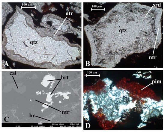 Piemontite typically occurs in rocks which are associated with low-grade metamorphism but it can also be produced by hydrothermal activity within manganese deposits []. Piemontite, as well as Sr-piemontite, is also found in the Kalahari Manganese Field []. Piemontite in this unit has low Fe content and high Mn and Al content (Table 4). Other phases that are present in the microbreccia unit include minor pectolite and barytocalcite. These accessory phases occur only within vugs. Pectolite tends to occur as fine, blocky aggregates or laths that appear to grow from the vug boundaries toward the centre. The pectolite in this study is easily distinguishable from sérandite in the thin section as it is brown in plane-polarized light. This unit contains the highest abundance of Ba-rich species in drill core SLT-015. Witherite and barite occur in more than one unit in drill core SLT-015 but barytocalcite has only been found in the microbreccia unit.