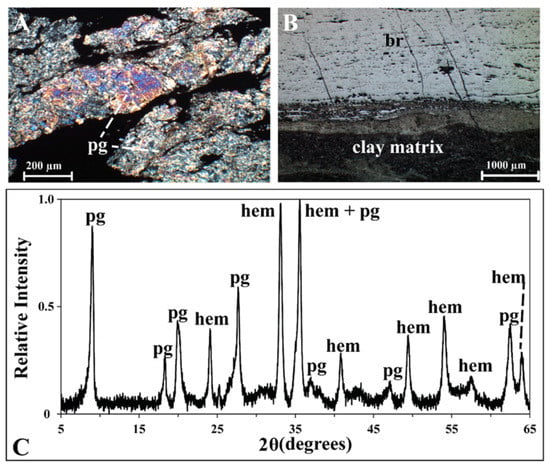 Massive ferromanganese ore. Reflected light microscopy reveals that this unit is microscopically laminated in places and that vugs are still present but not abundant. Parts of this unit show coarse-grained crystalline hematite. However, the most common textural feature is that of extremely finely laminated, crypto-platy hematite and hollandite (Figure 5D). Hollandite is a Ba–Mn oxide that is generally associated with supergene alteration but has also been found in contact-metamorphic manganese ores []. In this ore type, monomineralic clasts of braunite can be found in a matrix of laminated crypto-platy hematite and hollandite (matrix grain size <10 µm), where laterally discontinuous laminae have draped around the clasts. Microplaty hematite appears to be replacing the braunite-rich clasts in this case. A bulk rock powder X-ray diffraction spectrum of the matrix of this unit confirms the presence of hollandite, hematite and braunite (Figure 5E).