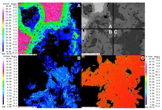 Compositional maps from the counterpart of the sample used for 40Ar/39Ar dating. The backscatter electron image in the top right of the figure shows the entire mapped area—dark grey areas effectively highlight microcline distribution. A. Fe concentrations in the matrix and vug margins showing zonation of Fe from high concentration at the boundary to low concentration in the centre—the mineral represented by ca. 25 % Fe (blue) is aegirine. B. Ca concentrations reveal the intergrowth of varying compositions of the sérandite-pectolite series. C. K concentrations are confined to microcline.