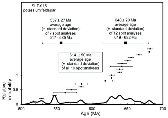 Adularia from drill core SLT-015 were dated by 40Ar/39Ar in situ ultraviolet laser ablation. Compositional maps were taken of the analysed sample (Figure 8). However, due to persisting radioactivity in the ablated sample, the opposite face was used for compositional mapping. Nineteen spot analyses yielded ages between 681.1 ± 3.2 Ma and 517.4 ± 5.0 Ma with a median of 627.7 Ma (Inter-quartile range: 570.9–650.5 Ma). The probability density distribution curve (Figure 9) was made by summing up all the normal distribution curves made from each age datum. The curve shows two main age groups with means of 648 ± 20 Ma (n = 12) and 557 ± 27 Ma (n = 7).