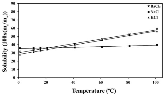 Solubility of BaCl2, NaCl, KCl in water as a function of temperature (experimental data from []). Key: ms = mass of the solute; mw = mass of water.