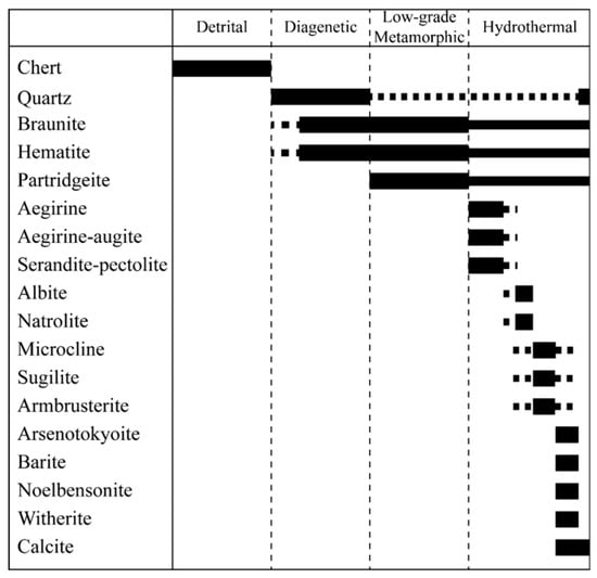 Arguably the most notable feature of the mineralogical and textural results described in the foregoing is the virtually complete absence of common, supergene-related Mn- and Fe-minerals such as romanechite, cryptomelane, pyrolusite, lithiophorite, ramsdellite and goethite, some of which have previously been described as part of the mineral assemblage of siliceous ores of the PMF []. The absence of a typical supergene mineral assemblage in the drill cores of the present study indicates that either: (i) supergene processes were not operative in producing the studied ores; or (ii) postulated supergene assemblages have been completely obliterated by subsequent hydrothermal re-constitution. It also raises the possibility that previously observed supergene Mn minerals may be genetically linked to younger supergene events that actually overprint the hydrothermal assemblages reported here and in other similar studies [,]. It therefore remains open whether the PMF deposits are true ancient-supergene ores, hydrothermally modified supergene ores, or largely hydrothermal ores that are variably overprinted by supergene processes.