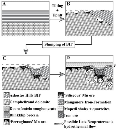 The model presented incorporates ideas of previous authors [,] but envelops all deposit types into one inclusive model (Figure 12). It also tentatively provides a source of alkali metals for hydrothermal activity in the PMF. First, the dolomitic rocks of the Campbellrand Subgroup were deposited, followed by BIF of the Asbestos Hills Subgroup (Figure 12A). Tectonic activity led to the development of the regional anticlinal structure known as the Maremane Dome. This tilting and related uplift was followed by erosion of both the Asbestos Hills and underlying Campbellrand Subgroup rocks, prior to the deposition of the Mapedi Formation of the Olifantshoek Supergroup (Figure 12B). This led to the development of a regional erosional unconformity. During this period, both surficial and subsurface karstification processes began within the dolomitic rocks of the Campbellrand Subgroup. As described by Plehwe-Leisen and Klemm [], the karstification would have preferentially (though not exclusively) developed along zones of weakness caused by tectonic activity. Where BIF overlay the dolomites, sub-surface cave systems developed. It was during this period of erosion that the Doornfontein conglomerates were deposited within the sinkholes. Clearly, the residual contents of karstic sinkholes are not only a function of the composition of the rocks being dissolved at the time, but also of the composition of previously overlying dolomites that had already been dissolved.