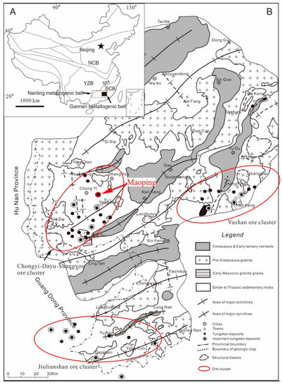 Figure 1. (A) A schematic tectonic map of China and the location of the Gannan metallogenic belt and the Nanling metallogenic belt; (B) the geology and distribution of the ore deposits in the Gannan metallogenic belt and the location of the Maoping tungsten deposit (modified from [41]).