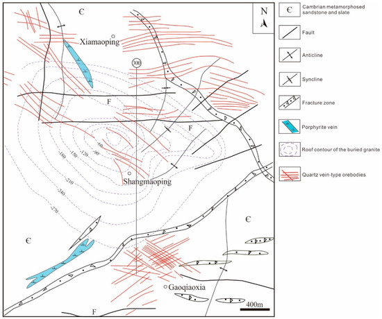 Maoping, with mineralized area of about 2 km2, is one of the largest W–Sn deposits in the Chongyi–Dayu–Shangyou ore cluster, which also hosts the world-class Xihuashan deposit [46,47]. Two types of orebodies were discovered and have been explored in this deposit: quartz vein-type orebodies and greisen-type orebodies. The quartz vein-type orebodies host 63,000 t of WO3 and 15,000 t of Sn with average grades of 0.97% WO3 and 0.30% Sn. The greisen-type orebodies host 40,000 t of WO3 and 35,000 t of Sn with average grades of 0.18% WO3 and 0.23% Sn [8]. The exposed strata of the mining areas consist mainly of Middle-Lower Cambrian low-grade metamorphosed sandstone and slate (Figure 2). Under the influence of the region’s structure, folds and faults are well-developed in the mining area. The major folds include the Maoping homocline and the Shenfuxi–Gaoqiaoxia anticline, which have ~N–S axes that are approximately parallel with the major fold axes in the Gannan metallogenic belt. The principal ore-controlling faults strike E–W and dip S or N at 50–75°, which are 300–500 m long and several tens of cm wide. The post-mineralization faults are two reverse faults that strike NE and NW, respectively.