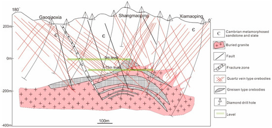 Figure 3. A geologic section in the Maoping tungsten deposit. See line 300 in Figure 2 (modified from [48]).