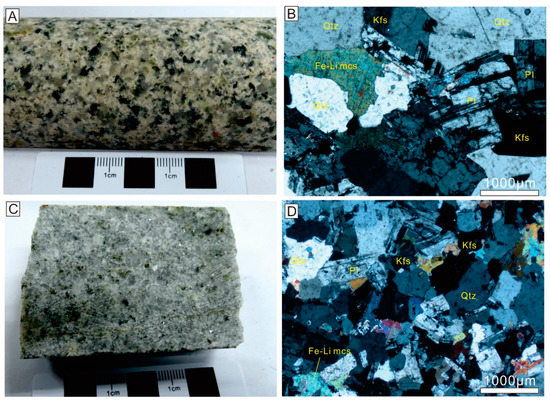 Intrusive rocks in the Maoping W–Sn deposit include a few exposed porphyritic veins and a buried granite pluton that was discovered during exploration (Figure 2 and Figure 3). The porphyrite veins are cut through by ore veins and are pre-mineralization intrusions. The hidden granite pluton occurs over an area of 0.5 km2, with the top elevation close to sea level. The Maoping granite extends in the E–W direction, and is comprised of medium–coarse-grained Fe–Li micas granite and fine-grained Fe–Li micas granite (Figure 4). The rock-forming minerals of medium–coarse-grained granite comprise quartz (35%~40%), plagioclase (30%~35%), K-feldspar (25%~30%), and Fe–Li mica (1%~5%). The major accessory minerals are zircon, monazite, fluorite, apatite, and topaz. The rock-forming mineral content of the fine-grained Fe–Li micas granite is similar to that of the medium–coarse-grained Fe–Li micas granite, except for the micas. Quartz vein-type W–Sn mineralization occurs at the upper levels, whereas deeper greisen-type W–Sn mineralization occurs at the top of the granite pluton (Figure 3).