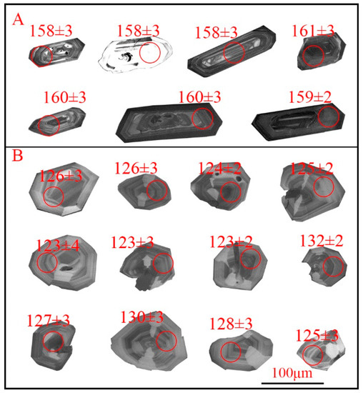 Cathodoluminescence (CL) images of zircon grains were obtained to reveal their internal structures using a JEOL JXA–8100 M electron microprobe equipped with a MonoCL (Gatan, Pleasanton, USA). LA-ICP-MS zircon U–Pb dating was performed using an Agilent 7500a ICP–MS attached to a 213 nm New Wave laser microprobe at the State Key Laboratory for Mineral Deposit Research (MiDeR), Nanjing University (NJU). The detailed analytical processes are similar to those of Jackson et al. [49]. Zircon Mud Tank (intercept age of 732 ± 5 Ma; [50]) was used as an external standard to control reproducibility and instrument stability. Standard zircon GEMOC GJ–1 (207Pb/206Pb age of 608.5 ± 1.5 Ma; [49]) was measured twice before and after each run to correct U–Pb fractionation. All of the spot analyses were carried out using a repetition rate of 5 Hz. The laser-ablation beams were 25 μm or 32 μm in diameter according to the sizes of the zircon grains. U–Pb ages were calculated from the raw signal data using the on-line software package GLITTER (ver. 4.4) [51,52]. Common Pb correction was carried out using the methods of Andersen [53]. Data processing was carried out using Isoplot (version 4.0) [54]. The uncertainties for the isotopic ratios of individual spots are reported at 1 σ, whereas uncertainties for their 206Pb/238U weighted mean ages are quoted at 2 σ confidence levels.