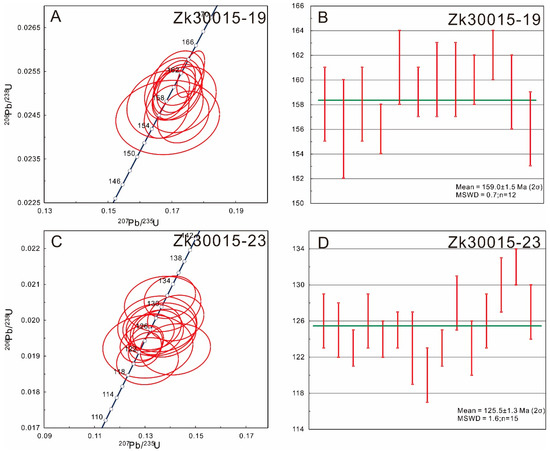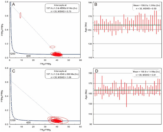 Thirty-six spot analyses on 31 cassiterite grains were carried out for sample Mp-5-11 from the quartz vein (Table 2). The cassiterite grains have countable U, but low Th contents. The composition of the 35 ablated spots on the cassiterite grains varies from 0.14 to 4.11 ppm total Pb, <0.10 ppm Th, and 4.9–164 ppm U, respectively. The analytical spots gave a Tera–Wasserburg U–Pb lower intercept age of 157.0 ± 1.3 Ma (2 σ, n = 35, MSWD = 0.75) (Figure 9A). After 207Pb-based correction, the analyses yielded a weighted mean 206Pb/238U age of 156.8 ± 1.5 Ma (2 σ, n = 35, MSWD = 0.59) (Figure 9B), which agrees well with the Tera-Wasserburg U–Pb lower intercept age within error. This indicates that this sample has low common lead content; thus, the age is less influenced and can accurately represent the crystallization age of the cassiterite in the quartz vein.